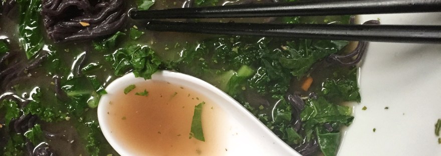 I used forbidden rice ramen and genmai (brown rice) miso. But you could combine regular ramen and just about any miso or miso/veggie soup broth combination.